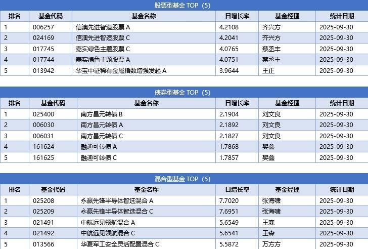单基金方面,剔除掉 创新封基类型 基金的影响,09月30日业绩表现最好的基金为永赢先锋半导体智选混合A,日增长率为7.7020%,其次为永赢先锋半导体智选混合C,日增长率为7.6951%、前海开源研究优选混合C,日增长率为5.7760%。