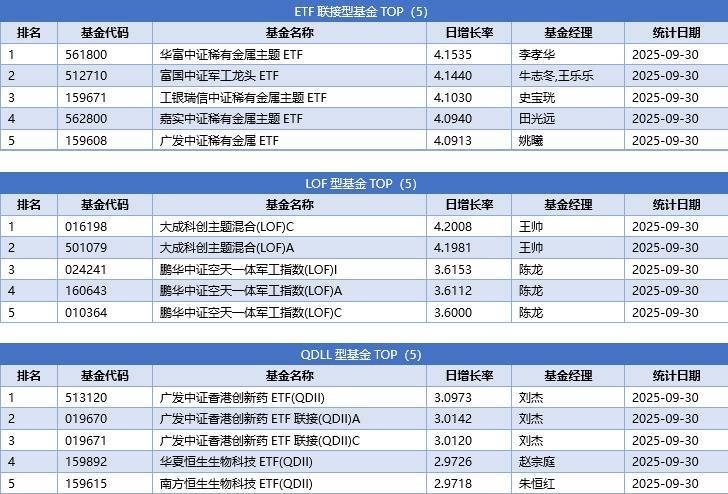 分投资类型看,同样剔除掉分级杠杆及固定收益两类基金的影响,股票型基金冠军为信澳先进智造股票A,日增长率为4.2108%;债券型基金冠军为南方昌元转债B,日增长率为2.1904%;混合型基金冠军为永赢先锋半导体智选混合A,日增长率为7.7020%;货币型基金冠军为银华交易型货币B,日增长率为0.0305%;ETF联接基金冠军为华富中证稀有金属主题ETF,日增长率为4.1535%;LOF型基金冠军为大成科创主题混合(LOF)C,日增长率为4.2008%;QDII基金冠军为广发中证香港创新药ETF(QDII),日增长率为3.0973%;下面是不同类型基金日增长率TOP5 (剔除掉分级基金的影响)