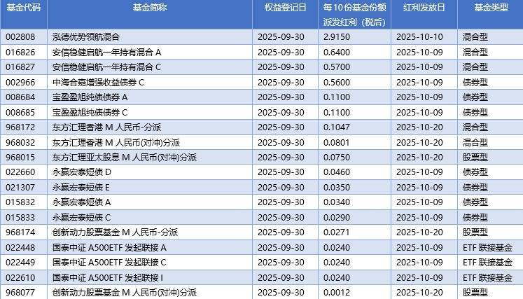 (1)09月30日新发基金共有14只,主要为债券型基金和ETF联接基金基金,其中宏利嘉利债券A募集目标金额达60.00亿元;基金分红18只,多为债券型,派发红利最多的基金是泓德优势领航灵活配置混合型证券投资基金,每10份基金份额派发红利2.9150元。